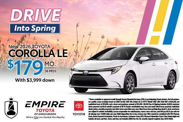 * Terms available on approved credit through Toyota Financial Services (TFS) at participating Toyota dealers. Not all customers qualify. Lease example based on 2026 Corolla 2WD 4Dr. Sedan LE L4 CVT-F Model 1852 with Total SRP of $24,229, net capitalized cost of $19,520, and a lease end purchase amount of $15,991. $3,999 Due At Signing includes $3,820 customer down payment and first month's payment of $179. Dealer contribution may vary and could affect lease payment. Individual dealer prices, monthly payment, and other terms and offers may vary. Must lease from participating dealer's stock and terms are subject to vehicle availability. Lessee responsible for maintenance, excess wear and use, and will pay $0.15 per mile for all mileage over 10,000 miles per year. $350 disposition fee is due at lease end. Offer cannot be combined with TFS Finance Cash, Down Payment Assistance, Trade-in Assistance, Customer Cash, APR, Finance Subvention Cash. Price listed might not include all taxes and fees. Taxes and fees not included. $899 doc fee. No security deposit required. Exp. 03/31/2026.