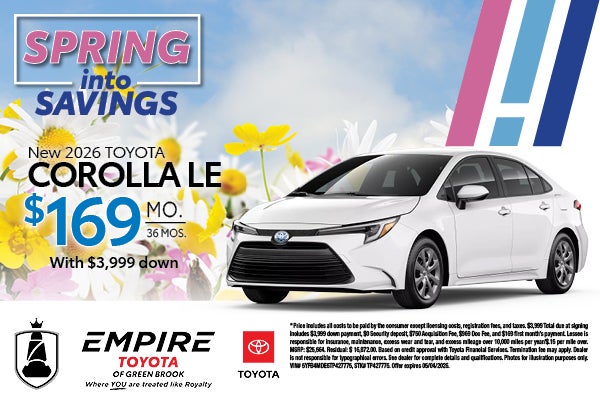 * Price includes all costs to be paid by the consumer except licensing costs, registration fees, and taxes. $3,999 Total due at signing includes $3,999 down payment, $0 Security deposit, $750 Acquisition Fee, $969 Doc Fee, and $169 first month’s payment. Lessee is responsible for insurance, maintenance, excess wear and tear, and excess mileage over 10,000 miles per year/$.15 per mile over. MSRP: $25,564. Residual: $ 16,872.00. Based on credit approval with Toyota Financial Services. Termination fee may apply. Dealer is not responsible for typographical errors. See dealer for complete details and qualifications. Photos for illustration purposes only. VIN# 5YFB4MDE5TP427775, STK# TP427775. Offer expires 05/04/2026.
